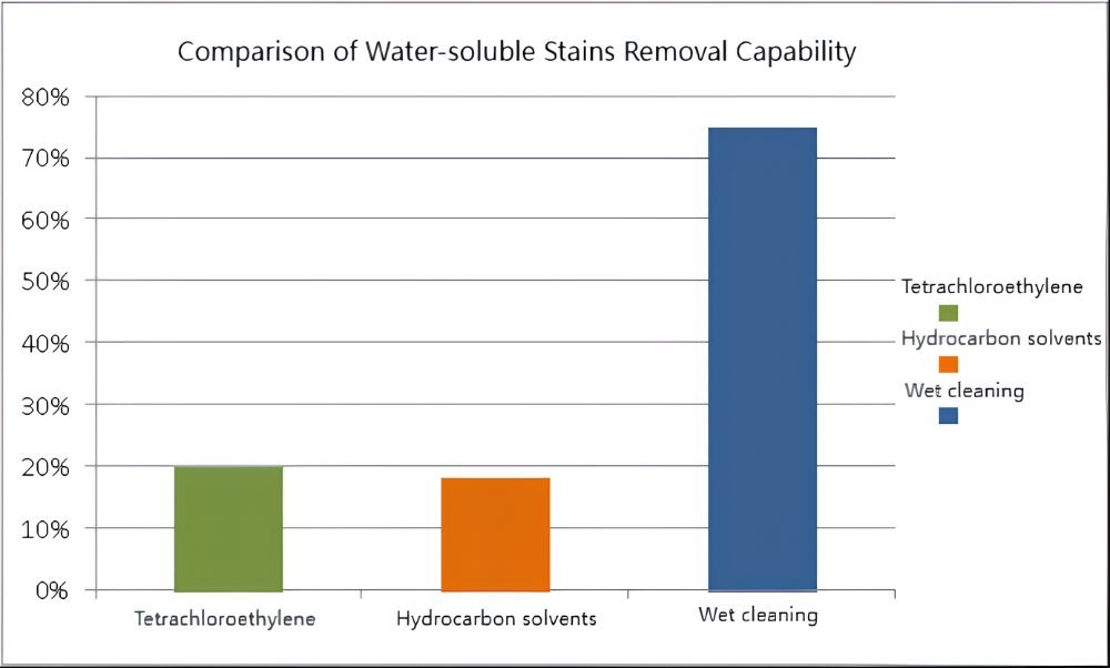 تمیز کردن مرطوب قوی ترین توانایی را برای از بین بردن لکه های محلول در آب دارد که می تواند به 75٪ برسد و پس از آن تتراکلراتیلن و حلال های هیدروکربنی قرار دارند.