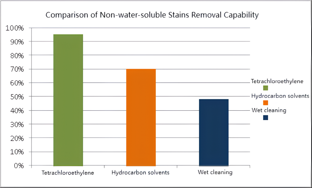 تتراکلراتیلن یک حلال خشک شویی تاریخی و رایج است. توانایی قوی در از بین بردن لکه ها دارد و نسبتاً ایمن است. با این حال، تتراکلراتیلن فراریت خاصی دارد و بویی تحریککننده دارد. هنگام کار در فضایی با تتراکلرواتیلن، افراد باید از تهویه مناسب اطمینان حاصل کنند. تنفس طولانی مدت در تتراکلراتیلن می تواند ناراحت کننده و مضر باشد.